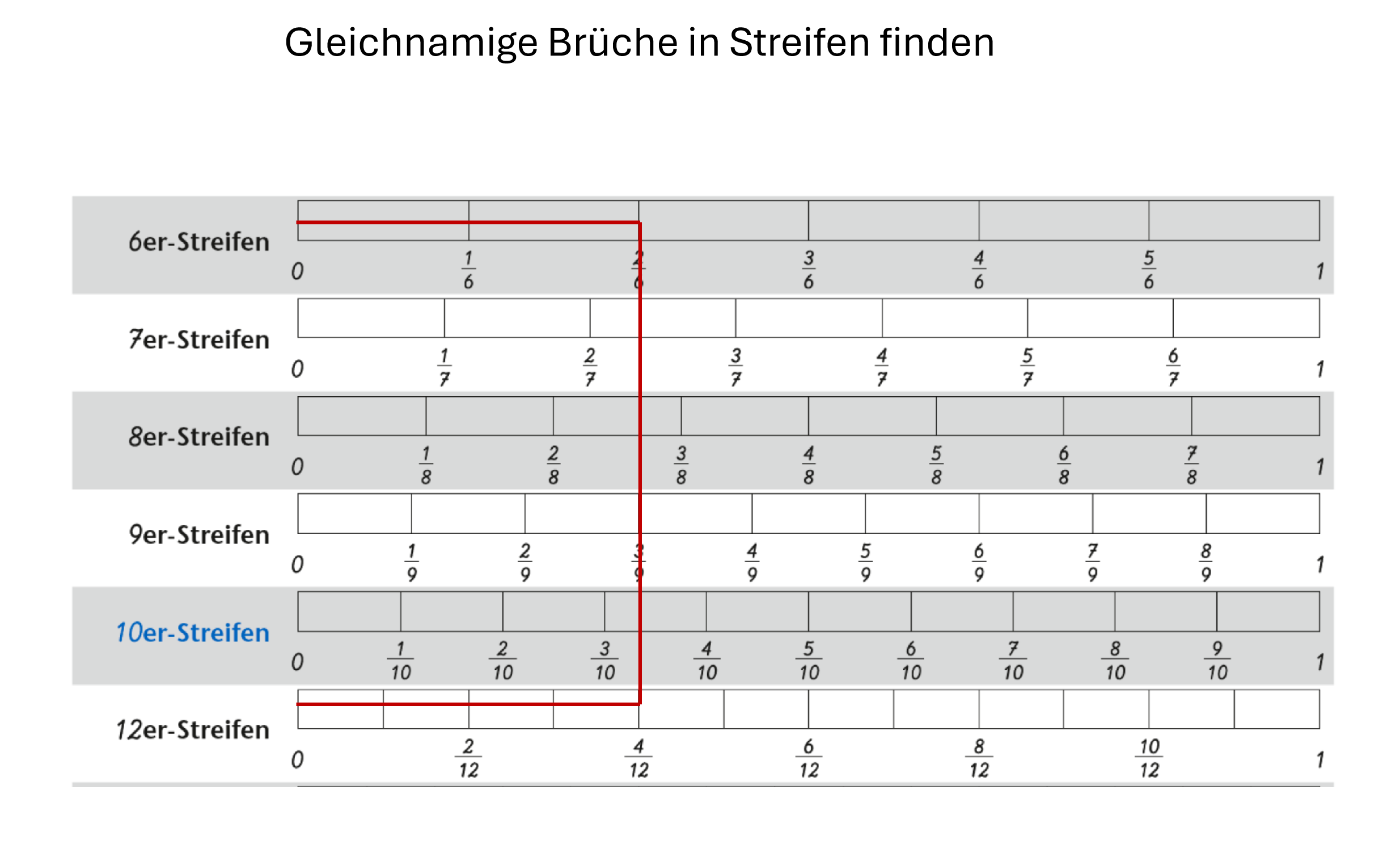 - Gleichnamige Brüche auf der Streifentafel finden, z.B. 2/6 gleich 4/12.