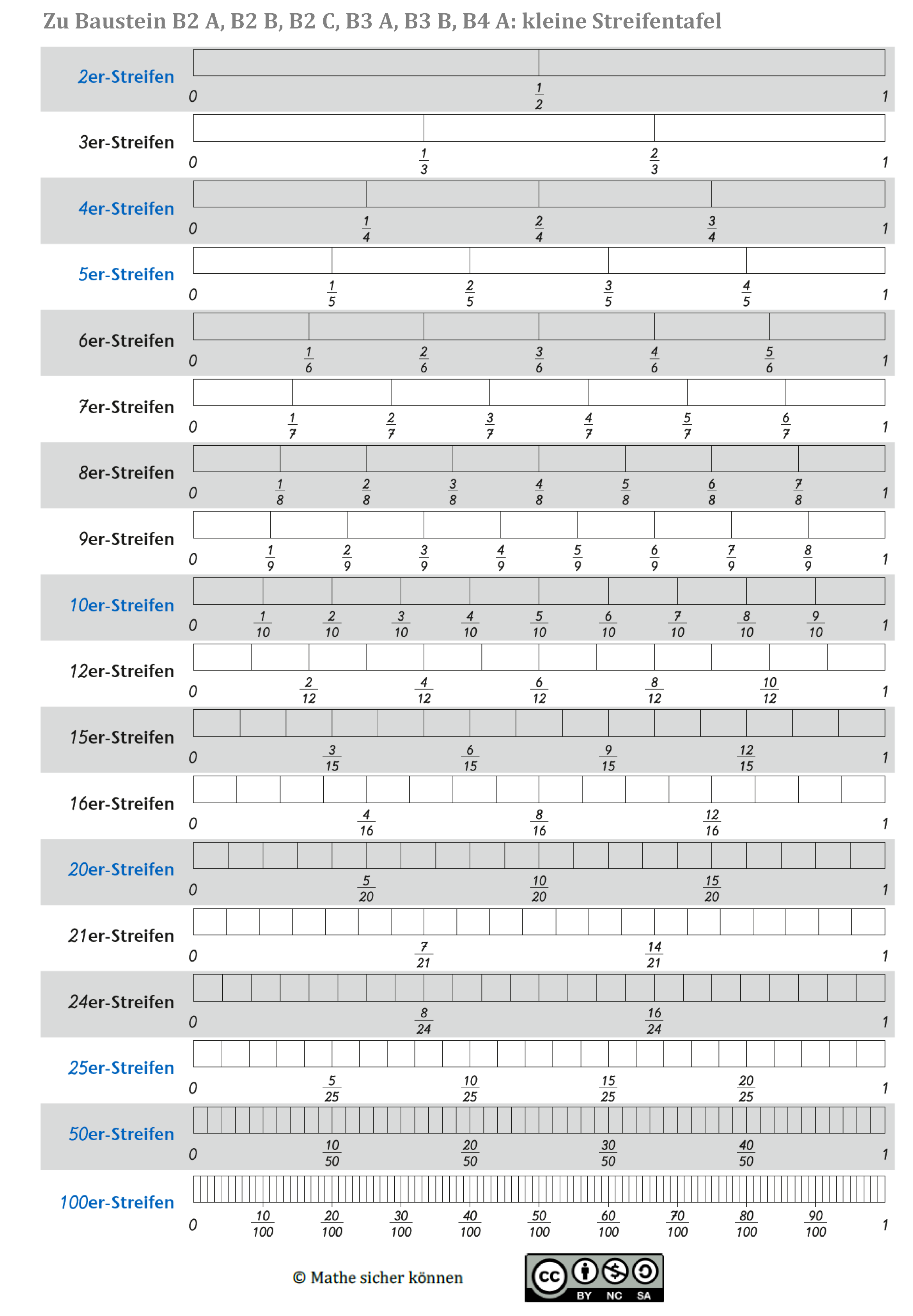 Dieses Anschauungsmittel wurde von Prediger eingeführt und hebt die Möglichkeit hervor, Brüche direkt zu vergleichen. Ihr Konzept liegt dem Buch „Mathe sicher können-Brüche“ (Cornelsen) sowie dem darauf basierenden Diagnose- und Förderkonzept von Mathe sicher können zugrunde, welches neben der Streifentafel auch weiteres Anschauungsmaterial und Arbeitsblätter kostenlos zur Verfügung stellt.
